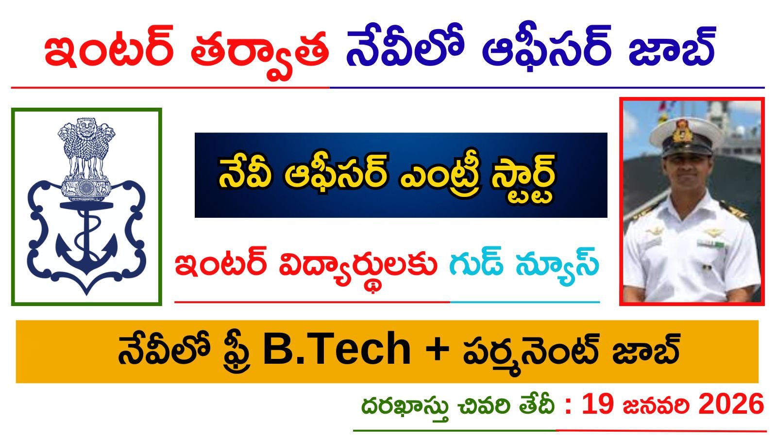 Indian Navy 10+2 B.Tech Cadet Entry 2026: ఇంటర్ విద్యార్థులకు నేవీలో ఆఫీసర్ ఛాన్స్ – అప్లై స్టార్ట్ దేశానికి సేవ చేయాలనే కల, యూనిఫామ్‌లో గర్వంగా నిలబడాలనే ఆశ ఉన్న ఇంటర్ విద్యార్థులకు ఇండియన్ నేవీ నుంచి భారీ శుభవార్త వచ్చింది. Indian Navy 10+2 (B.Tech) Cadet Entry Scheme – July 2026కు సంబంధించిన అధికారిక నోటిఫికేషన్‌ను జనవరి 1, 2026న విడుదల చేసింది. ఈ నోటిఫికేషన్ ద్వారా పురుషులు మరియు … Read more